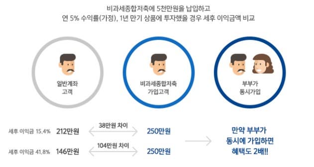 간단하게 알려드리면, 예금이자 5천만 원까지 세금을 안내요. 은행에 가셔서 예금 상품 가입할 때 비과세 종합 저축으로 해 달라고 말씀만 하시면 돼요..