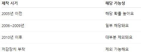 많이 궁금해하시는 부분이 “몇 년식부터 노후차냐”예요. 정확히는 연식 + 배출기준이 함께 적용돼요.