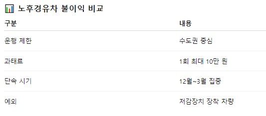 노후경유차는 알고 대비하면 지원금과 혜택을 받을 수 있지만, 모르고 지나치면 과태료·운행 제한이라는 손해로 돌아올 수 있어요.
