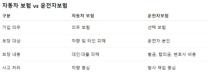 반면 운전자보험은 교통사고로 인해 발생할 수 있는 형사적 책임, 벌금, 변호사 비용 등을 보장하는 보험이에요.