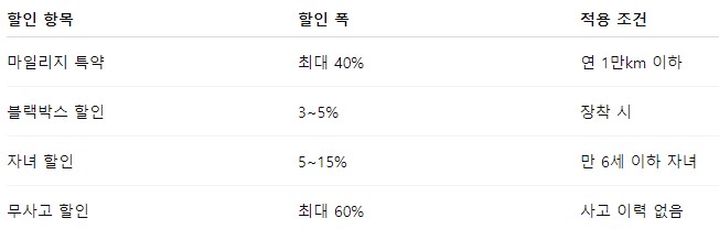 아래 표는 실제로 많이 활용되는 할인 특약 정리예요.
