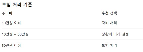 또한 보험 처리를 하면 보험료 할증이 발생할 수 있기 때문에 장기적인 비용을 고려해 판단하는 것이 중요해요.