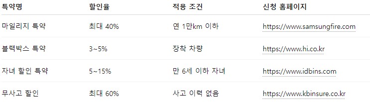 자동차 보험에서 가장 많이 활용되는 할인 특약을 먼저 정리해볼게요.