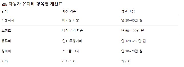 2. 자동차 유지비 항목별 계산 방법