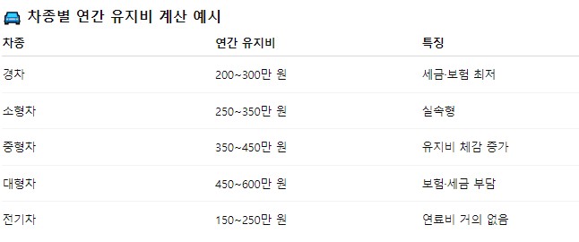 3. 차종별 자동차 유지비 계산 예시