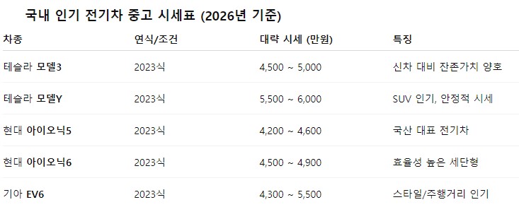 2. 인기 전기차 모델 2026 최신 중고 시세 비교표