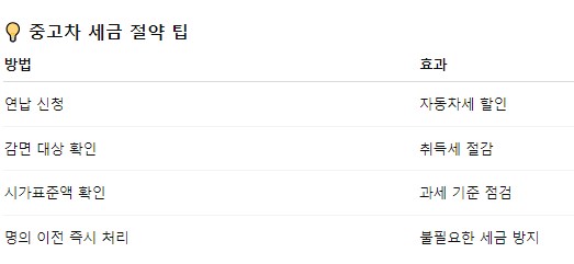 중고차 세금은 어렵지 않지만, 모르면 손해를 보는 영역이라 할 수 있어요.