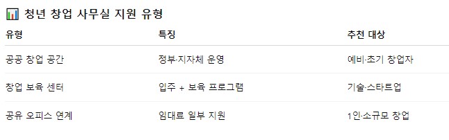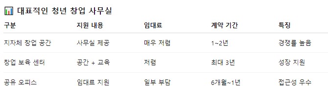 청년 창업 사무실 지원은 크게 세 가지 유형으로 나눠요.