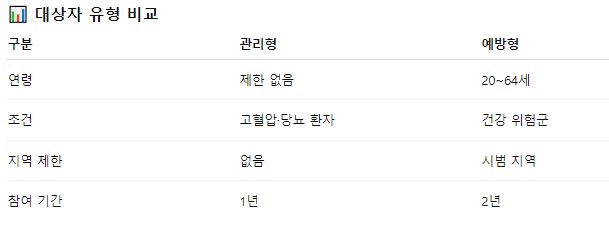 예방형은 20~64세가 기본 조건이며, 다음 중 하나라도 해당하면 ‘건강 위험군’에 포함돼요..