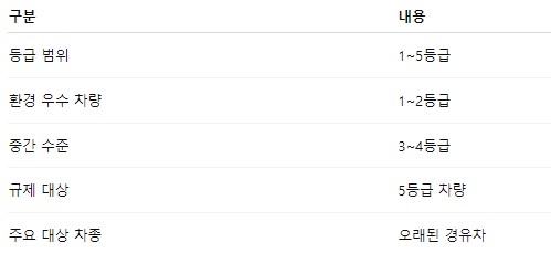 배출가스 등급제는 차량이 배출하는 오염물질 수준에 따라 1등급부터 5등급까지 나누는 제도예요.