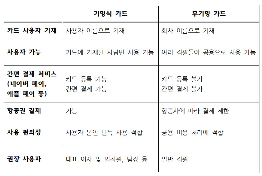 대표님 및 임원에게는 기명식 카드를 발급하여 간편 결제와 개인별 사용 기록 관리를 용이하게 하고, 공용 비용 처리를 위해서는 무기명 카드를 함께 발급받는 것이 보다 효율적 이예요.
