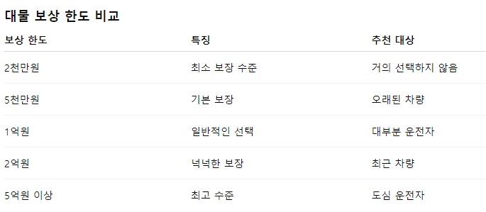 그래서 자동차 보험 가입 시 대물 보상 한도를 충분히 설정하는 것이 매우 중요해요.