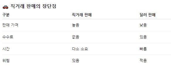 중고차를 딜러에게 판매하면 편리하다는 장점이 있지만, 그만큼 중간 수수료와 가격 차이가 발생해요.