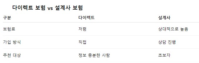 최근에는 대부분 다이렉트 보험이 설계사 보험보다 저렴한 구조예요.