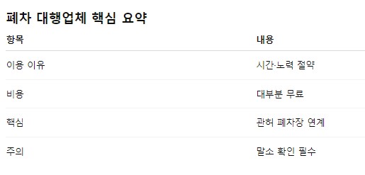 직접 폐차장을 방문하기 어렵거나, 절차가 복잡하게 느껴질 때 폐차 대행업체를 이용하면 견인부터 말소까지 한 번에 처리할 수 있기 때문이에요.